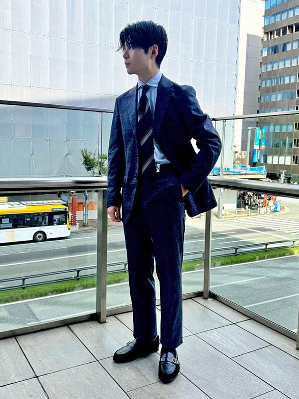 同素材の共生地パンツと併せてスーツ(2パンツも可)スタイル