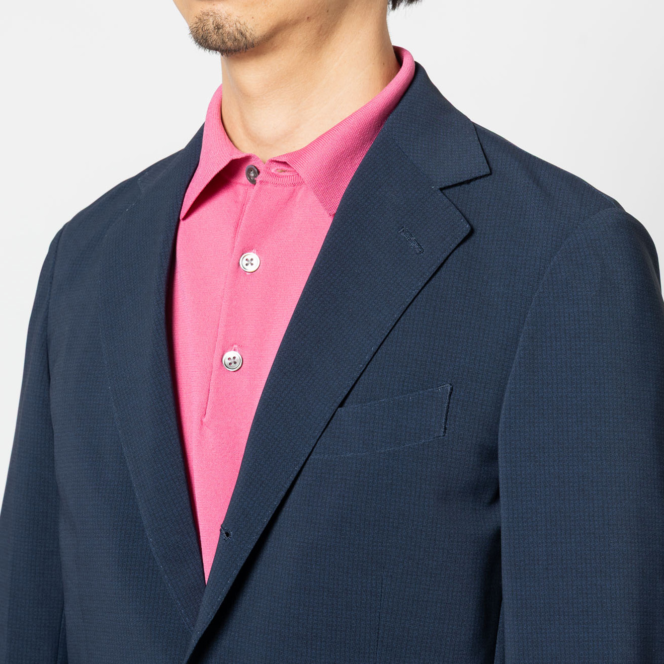 肩パッド不使用のナチュラルな肩周り、さらに毛芯をなくし、オンリー史上最軽量の軽やかさで快適な着心地を実現。