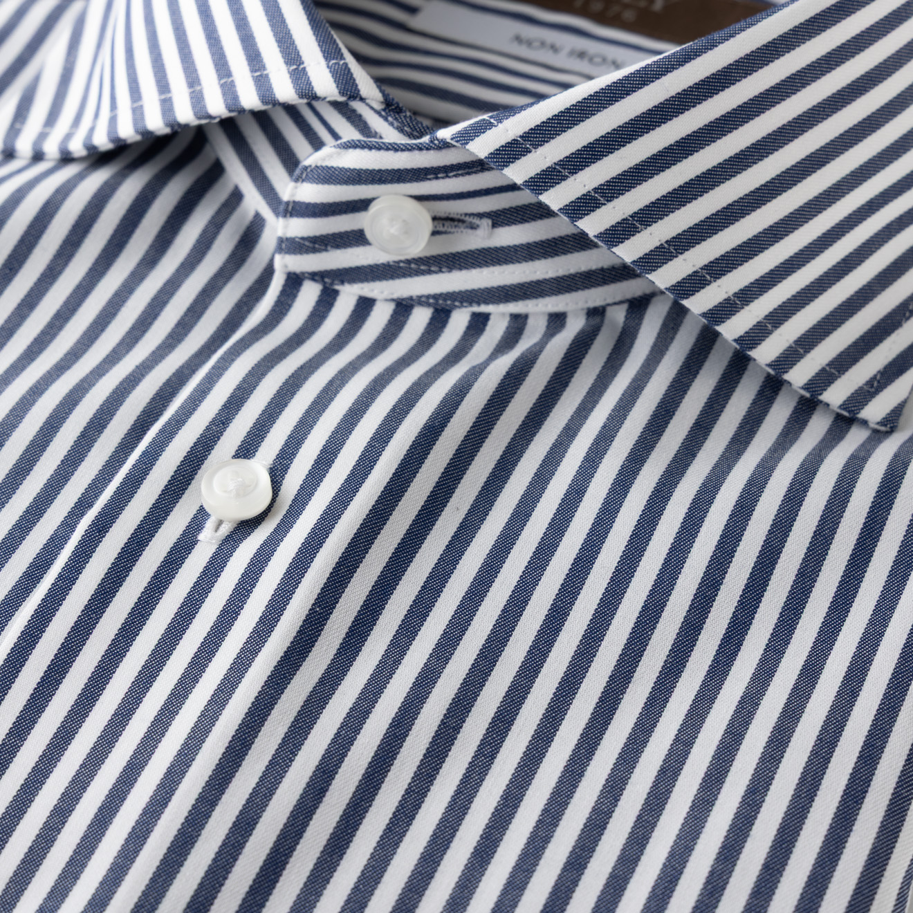 特殊な糸使いで、繊維内部を改質して防シワ性を高める「液体アンモニア加工+モイストキュア加工」を施し、綿の風合いを損なうことなく、高い形態安定性能を持たせた綿100%のノンアイロンシャツです。