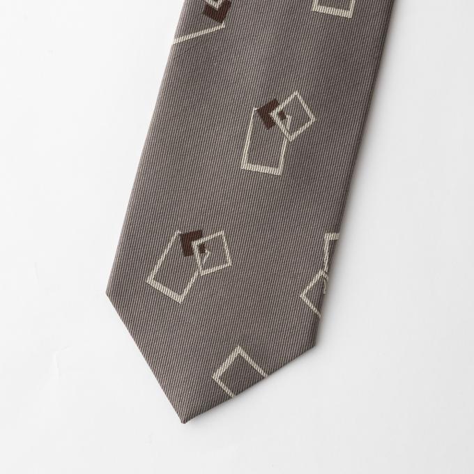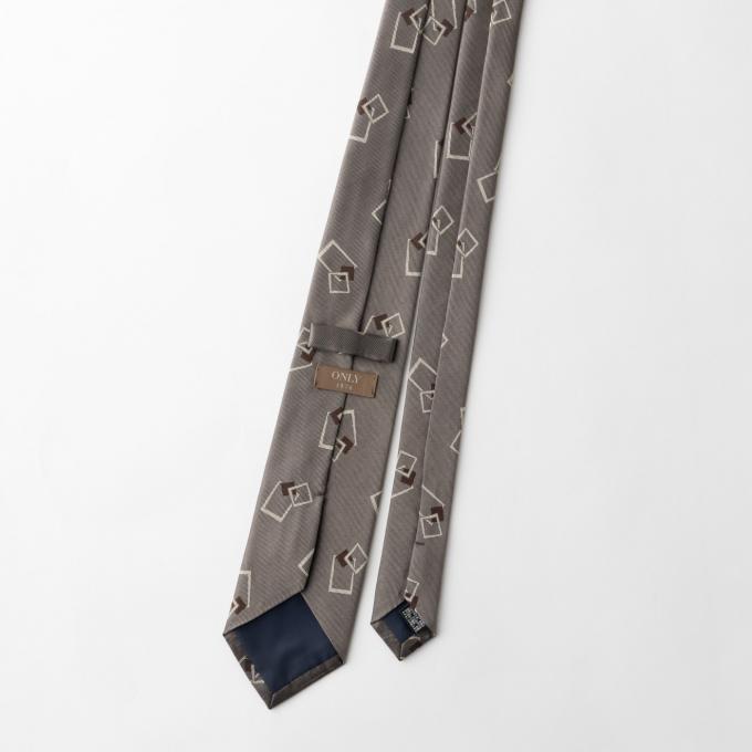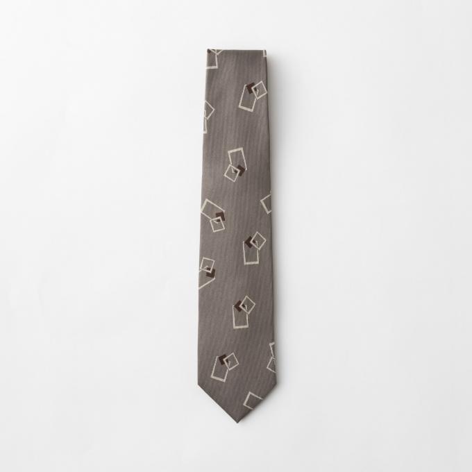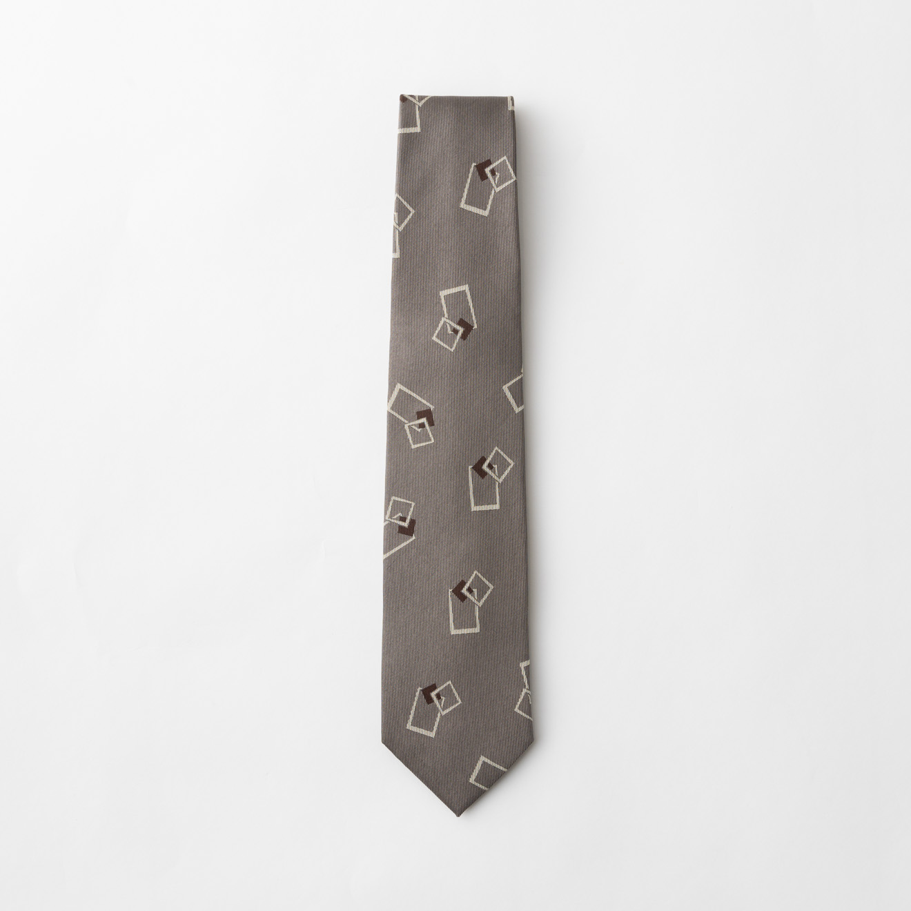 グレーがかったベージュをメインに、スクエア調の小紋柄を配したネクタイ。