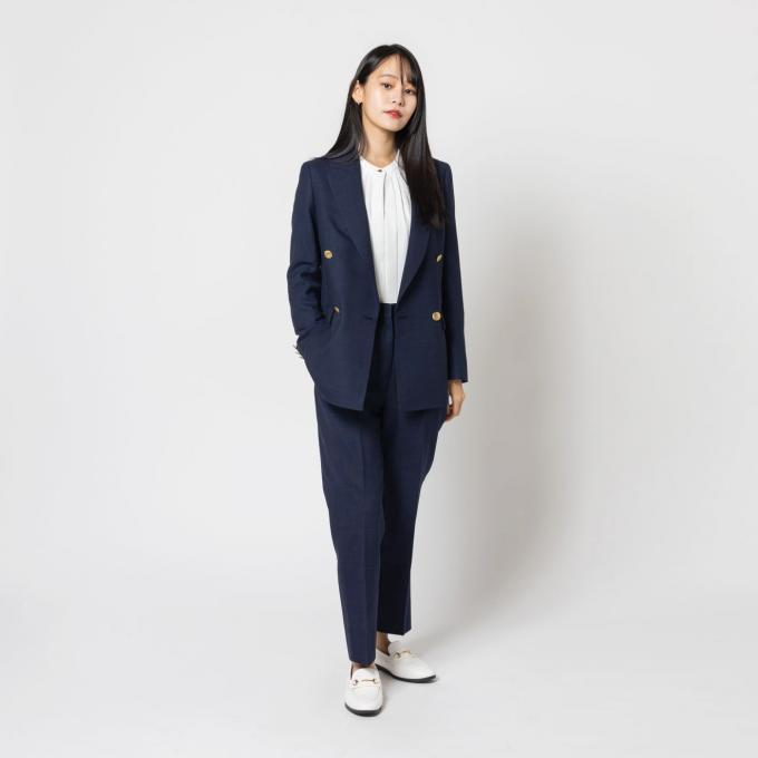共生地の4つ釦ジャケットとあわせてセットアップとしても着用可能。