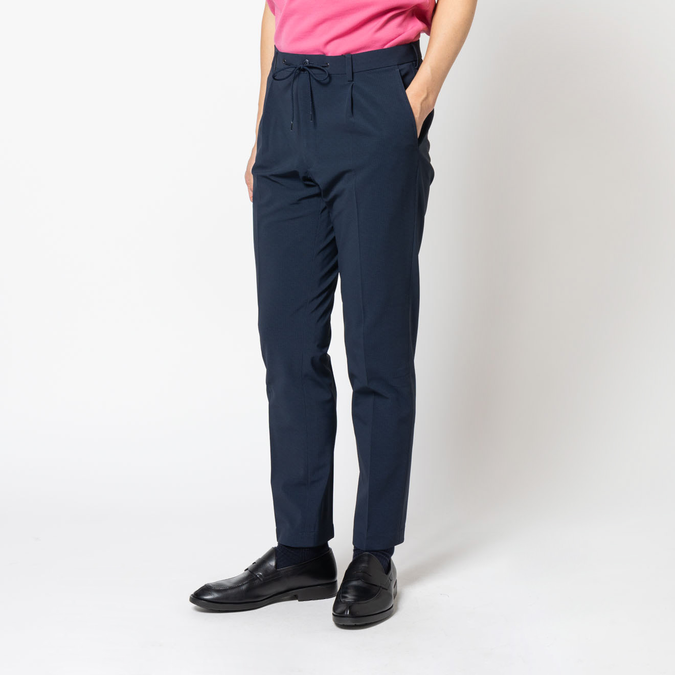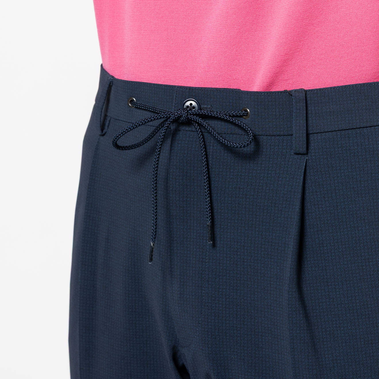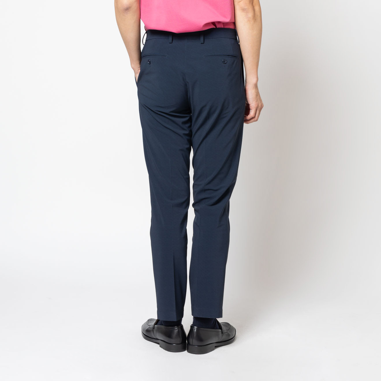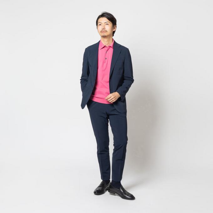 ジャージー素材でありながら、ビジネスシーンにも対応する端正な印象に仕上げています。