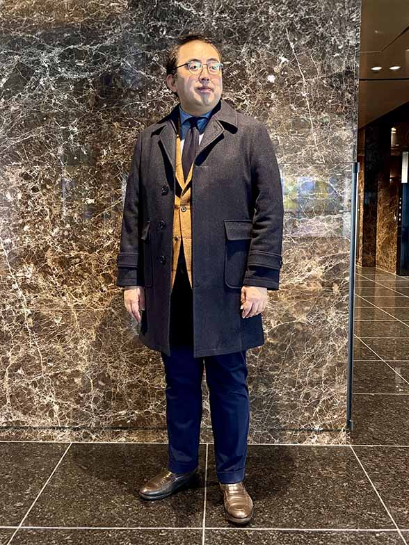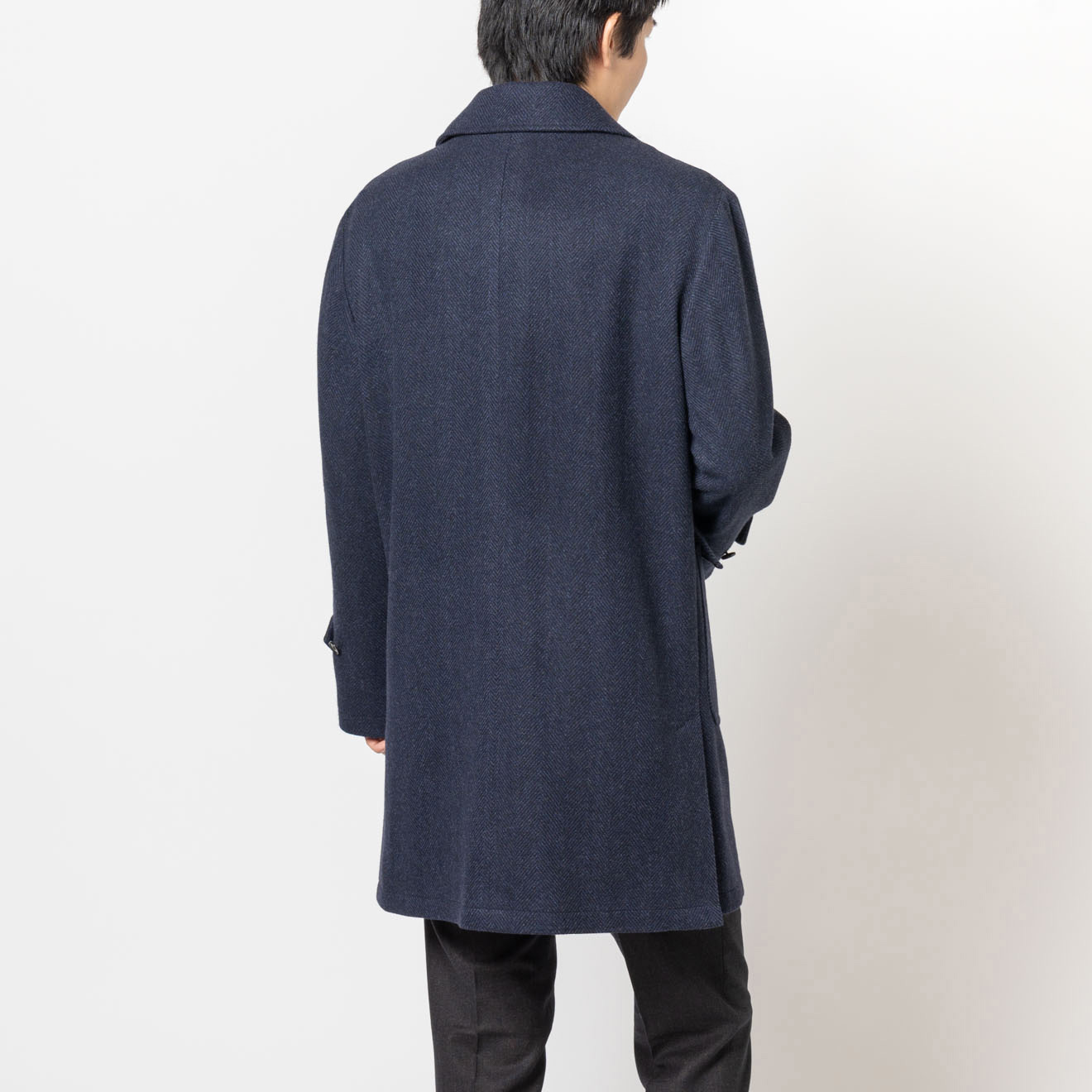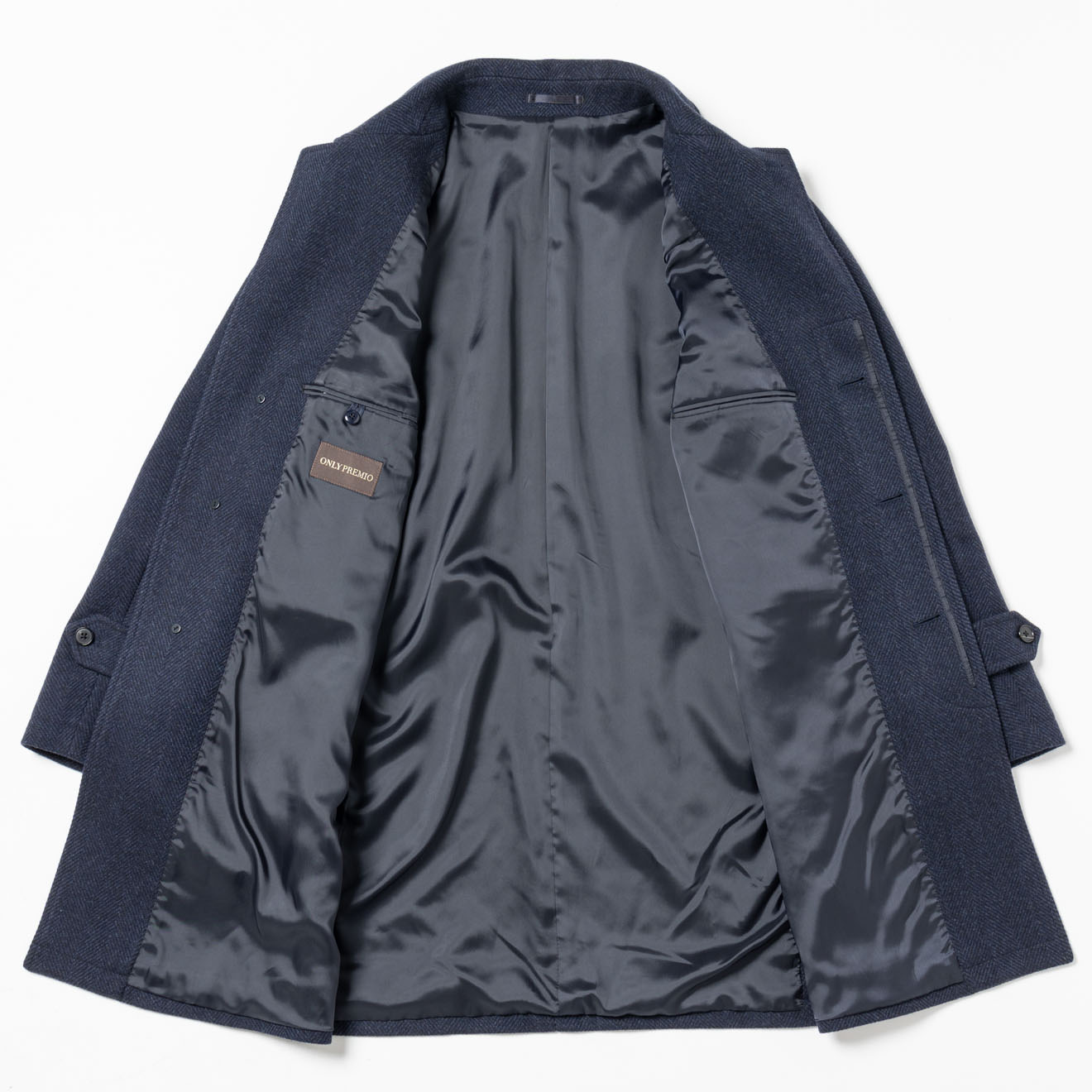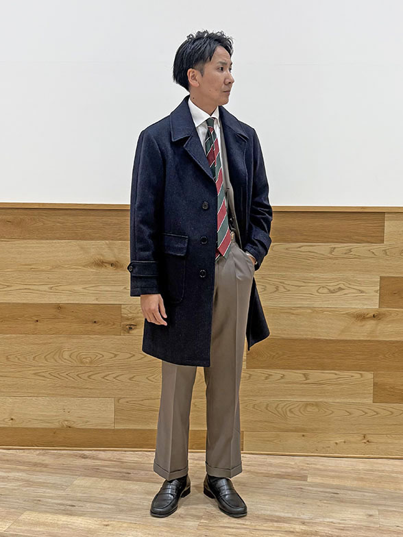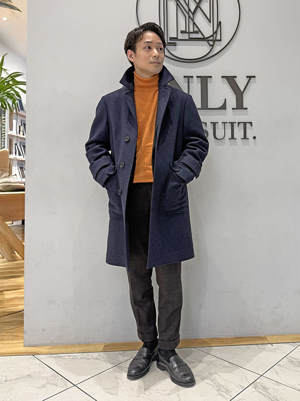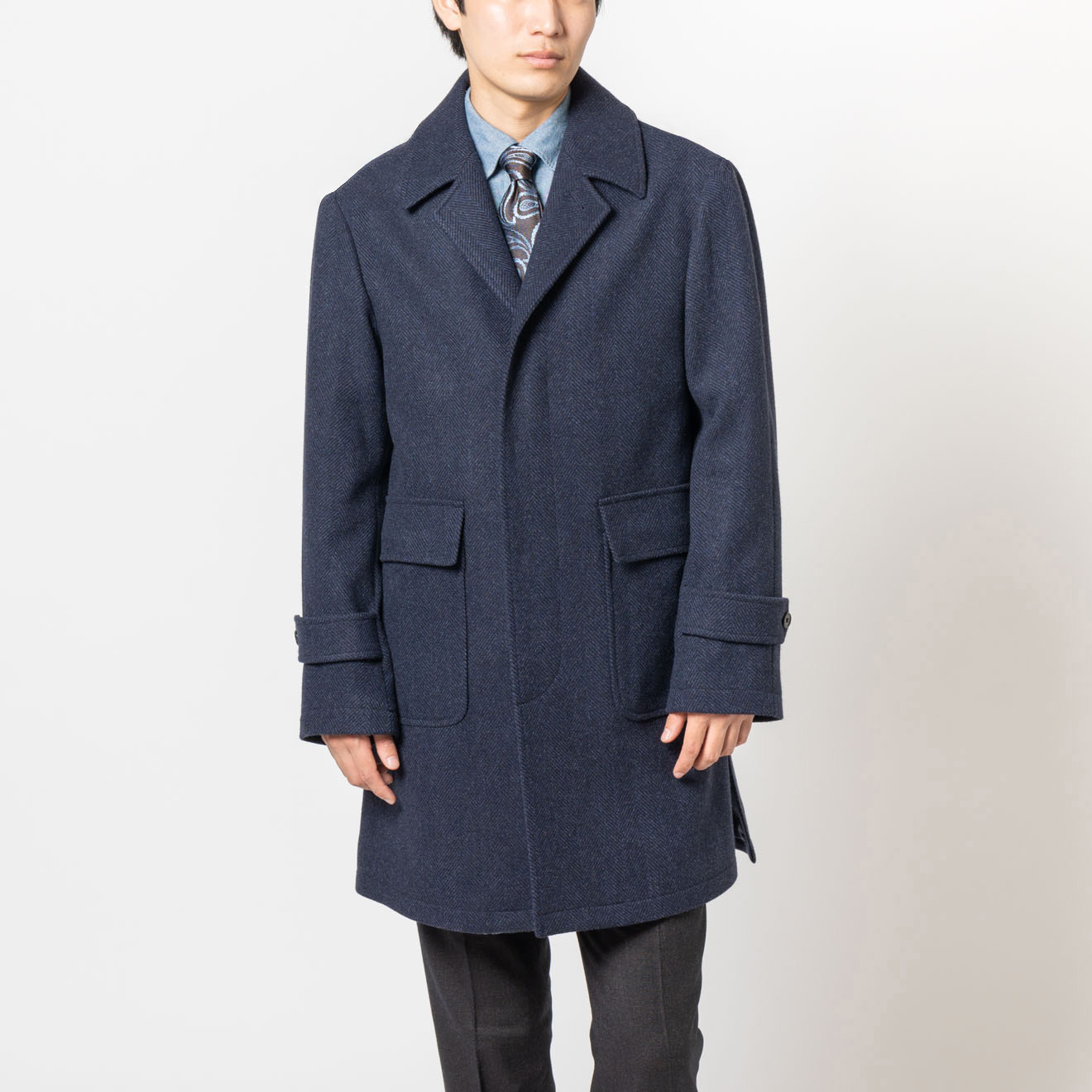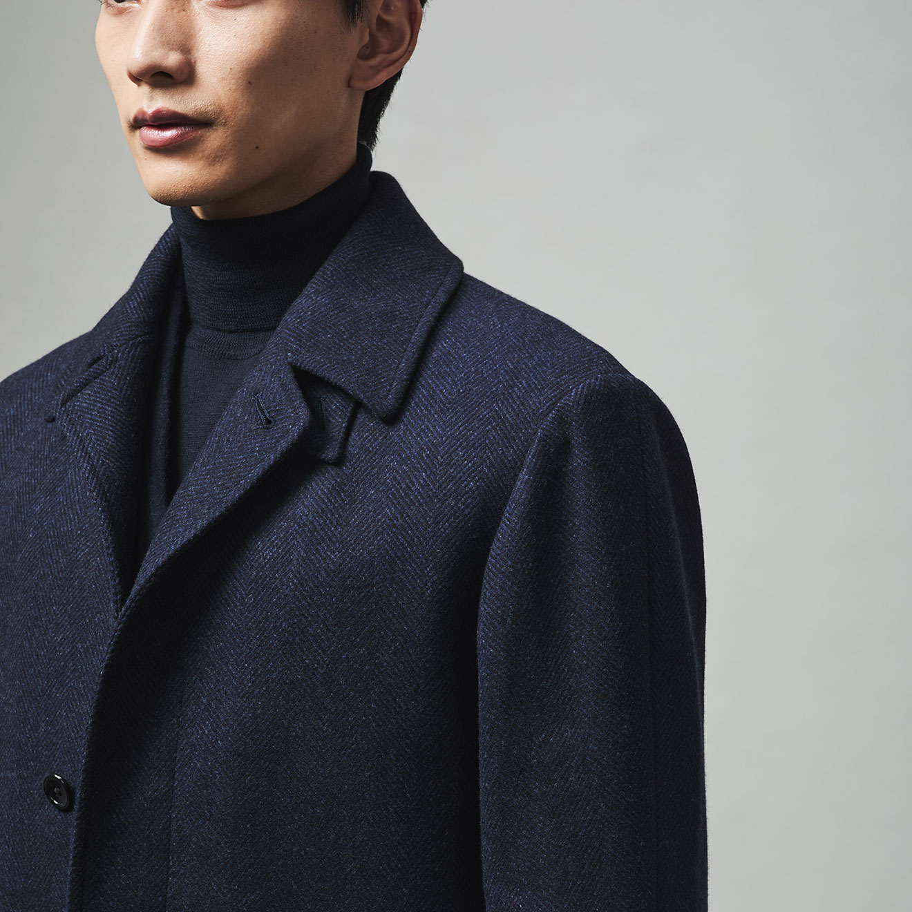 膝上丈のクラシックなシルエットに、両サイドのベントを配し、伝統的ながらもモダンに仕上げた今季の新型オーバーコートです。
