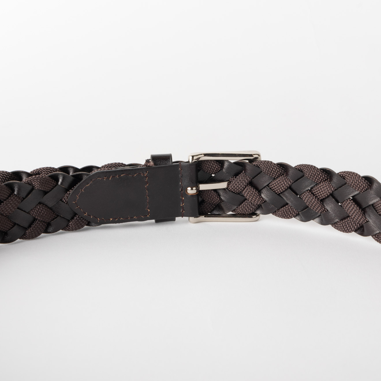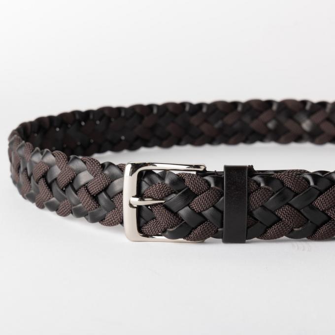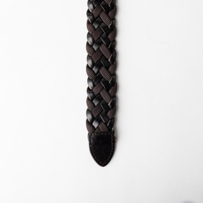短冊状に裁断されたレザー調と、ブラウン色のゴムを交互に編み込み、上品さのあるカジュアルな雰囲気と、ファッション性のあるコンビネーションベルトに仕上がています。