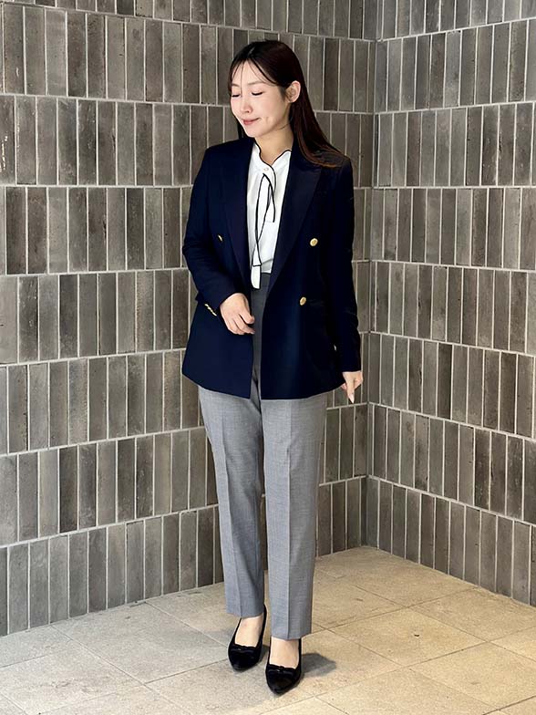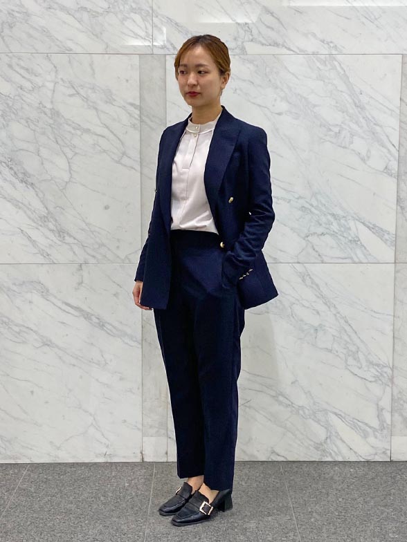 共生地のパンツと合わせてスーツスタイルとしても楽しめます。