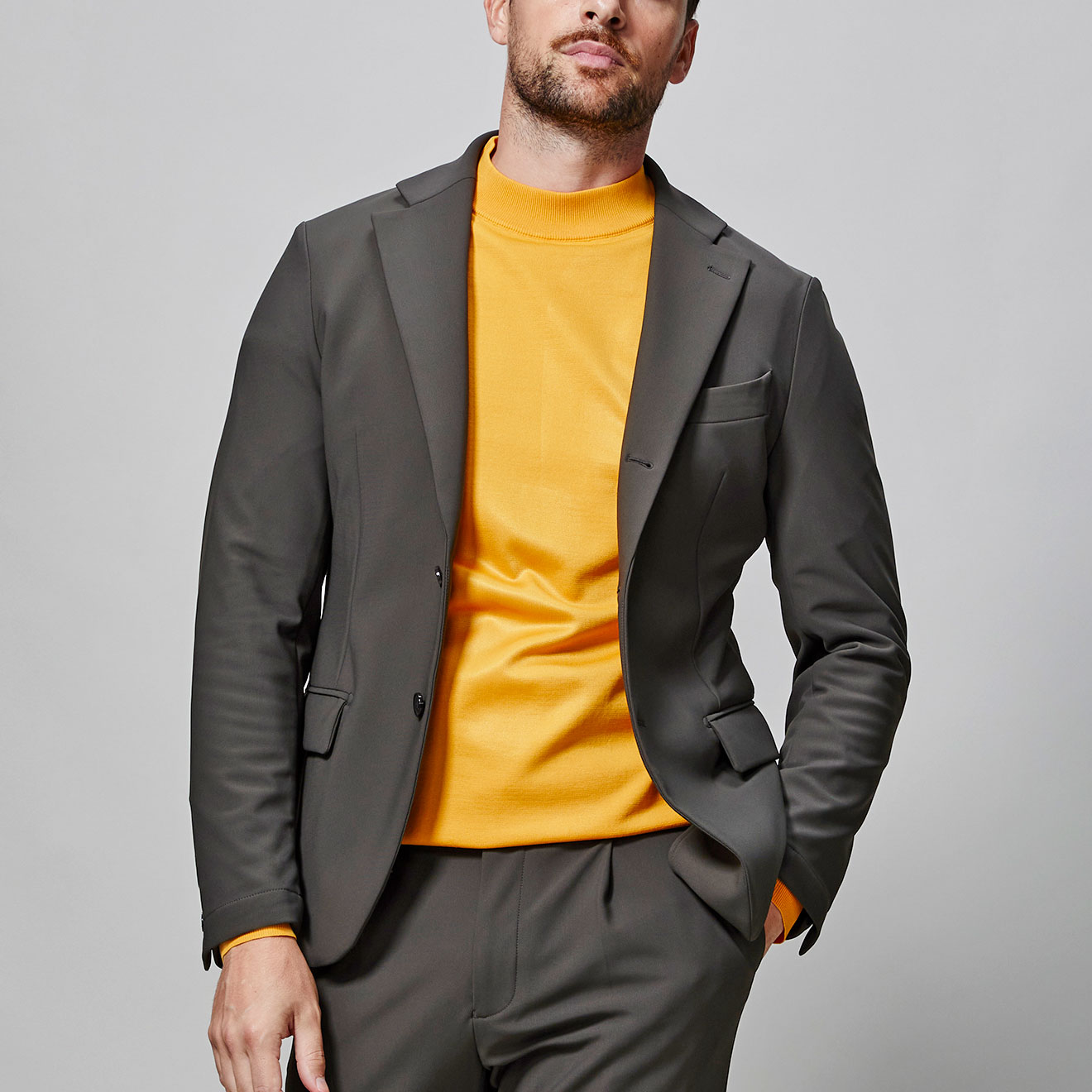 ストレッチライニングのボンディングに加え、素材感ある表情できちんとした佇まいです。