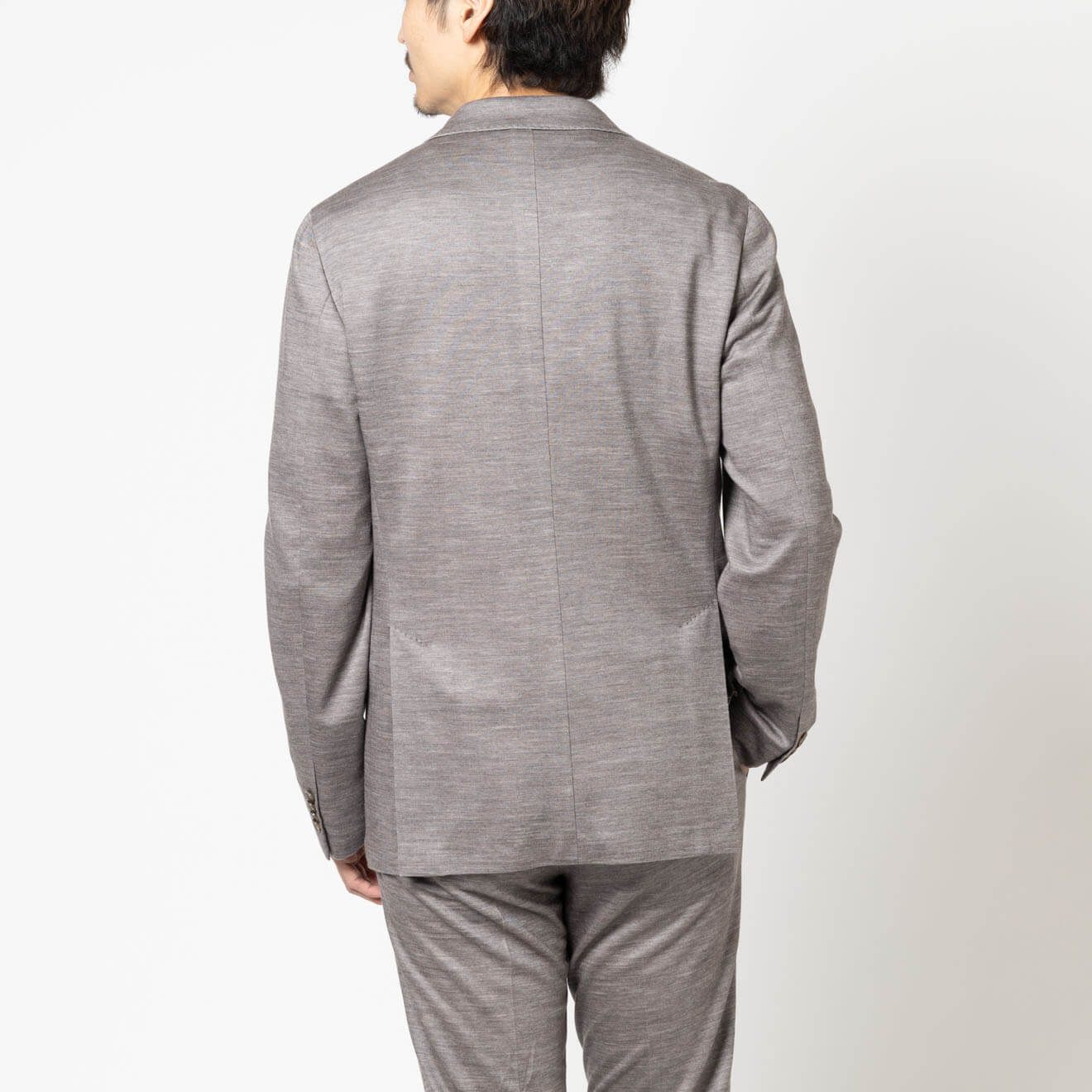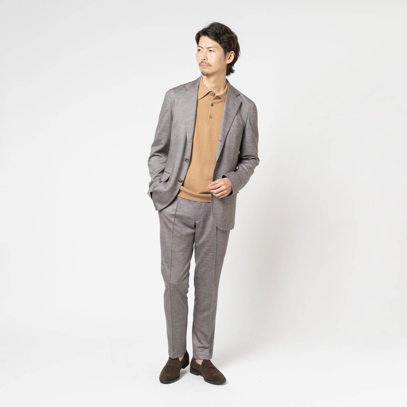 サンタルチアZEROモデル採用により、通常のセットアップモデルに比べクラシックな印象。組下のパンツはクリースをたたき仕上げにし、高級感のある見た目は保ちつつ、スポーティさを演出。