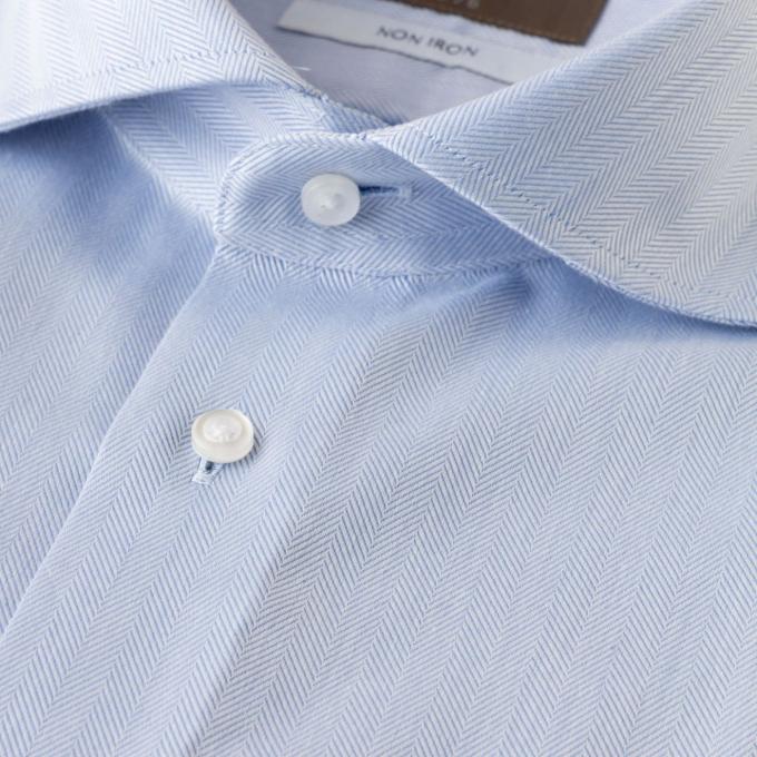 特殊な糸使いで、繊維内部を改質して防シワ性を高める「液体アンモニア加工+モイストキュア加工」を施し、綿の風合いを損なうことなく、高い形態安定性能を持たせた綿100%のノンアイロンシャツです。