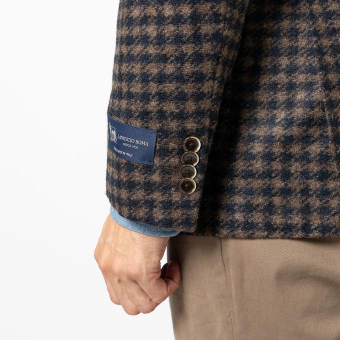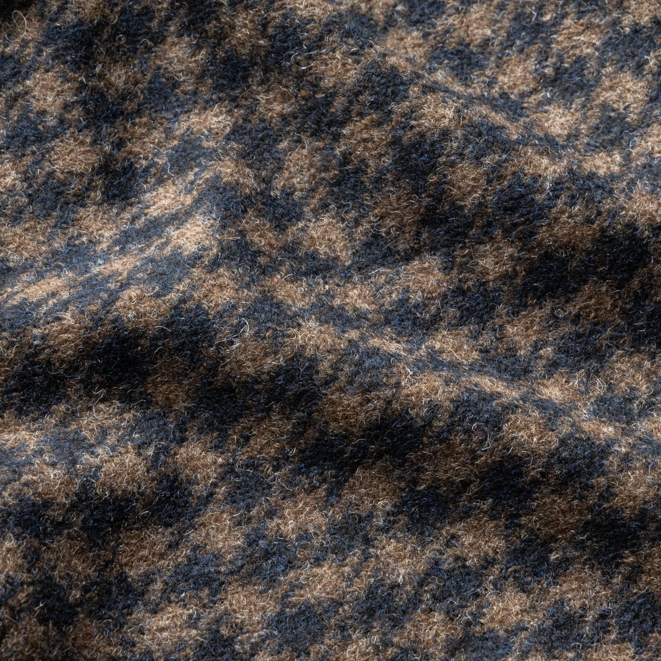 ツイーディで温かみのあるチェック柄生地は、ローマ社製のアクリルウールベースのジャージー素材。