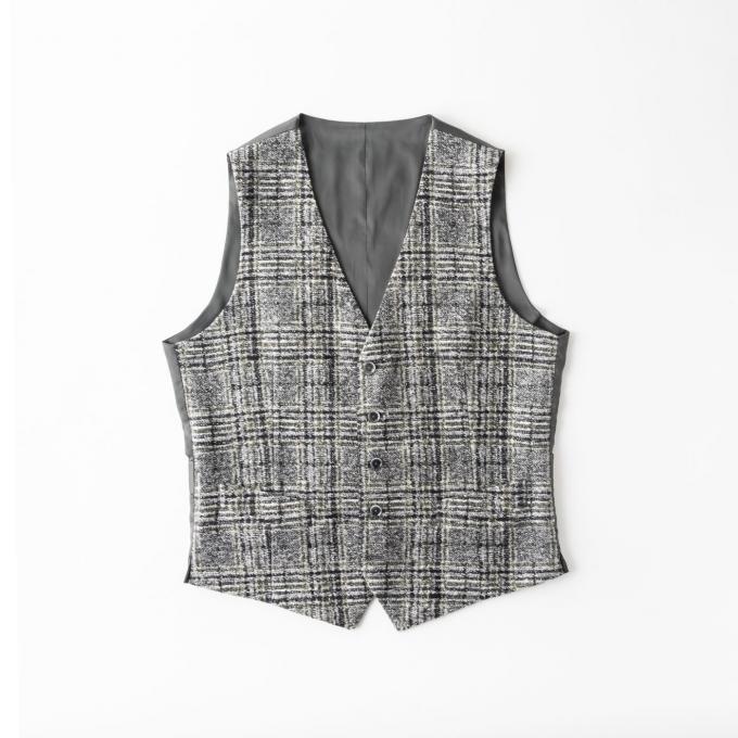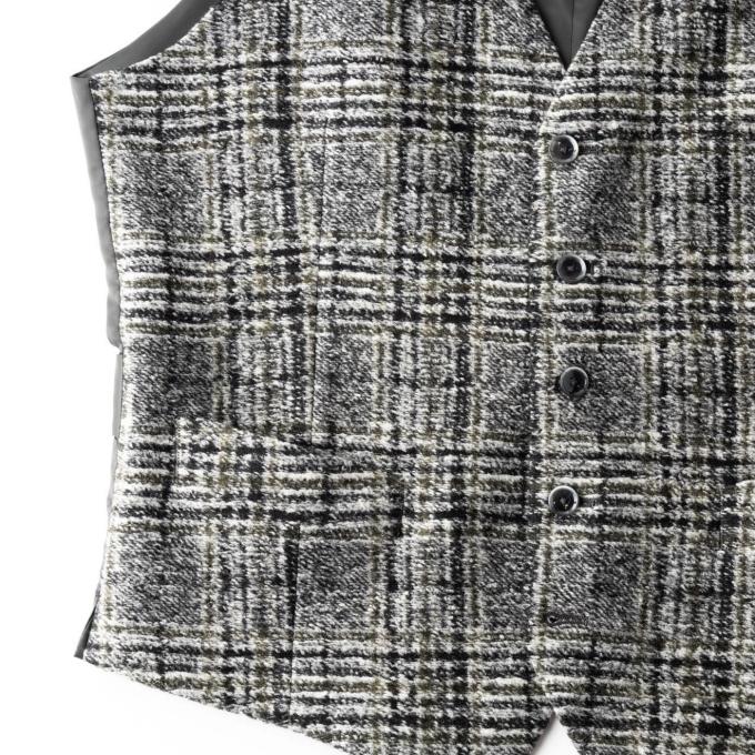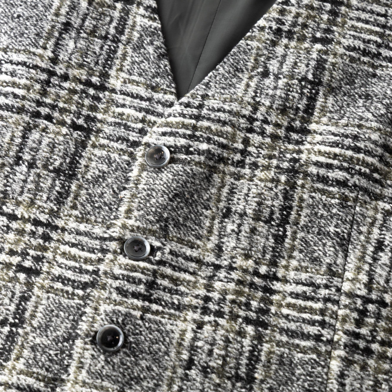 ツイーディで温かみのあるチェック柄生地は、ローマ社製のアクリルウールベースのジャージー素材。