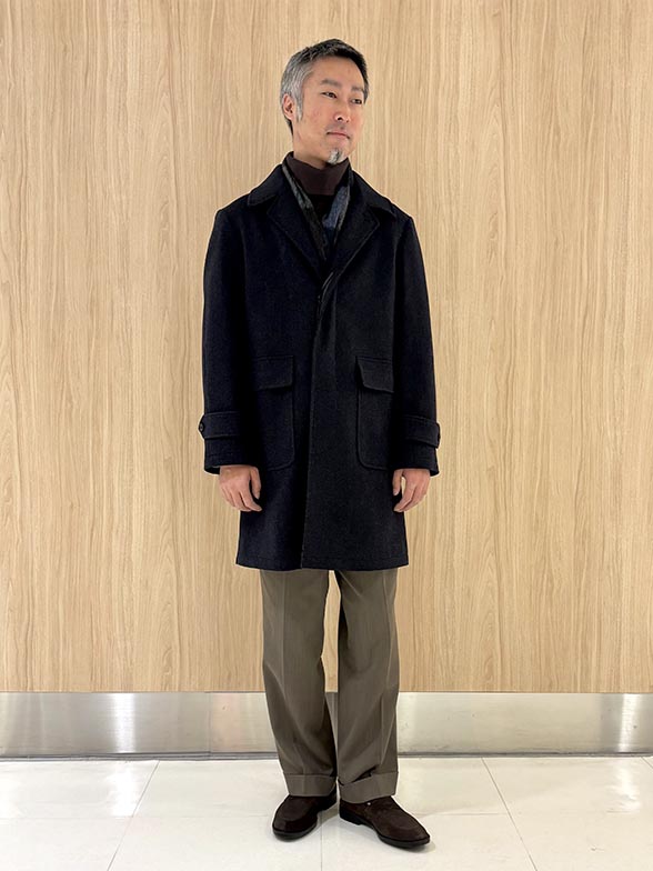 膝上丈のクラシックなシルエットに、両サイドのベントを配し、伝統的ながらもモダンに仕上げた今季の新型オーバーコートです。