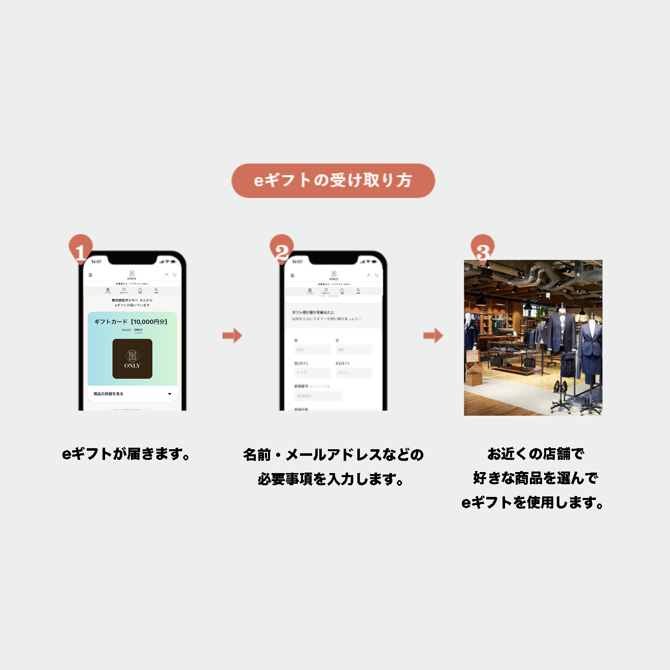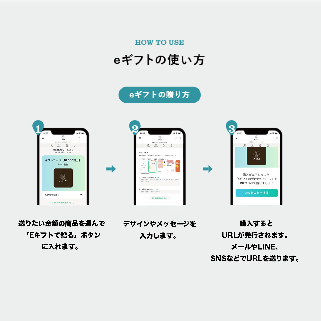 在庫システム障害のため、在庫表示に誤りがございます。 ONLY eギフト【30,000円分】 ¥ 30,000 (税込) ONLY 豊富なサイズ展開と機能性を取り入れた、ベーシックライン 在庫システム復旧中 現在、在庫システムの不具合により一部商品の在庫表示に誤りが生じております。 そのため各店舗の在庫は、店舗までお問い合わせください。 復旧までお時間がかかります。ご迷惑をお掛けし誠に申し訳ございません。 閉じる 閉じる 北海道関東東海・中部京都大阪・神戸中国・九州 閉じる 数量 1 2 3 4 5 6 7 8 9 10 カートに入れる or 店舗試着 納期 : 翌営業日発送 お気に入りに追加 オンリーメンバーズ4つの会員特典 1 5%OFFクーポンプレゼント 2 年2回お買い上げ総額の7%をポイント還元 3 お誕生日の方はスーツ購入がお得 4 来店ごとに100円分のポイント加算(アプリのみ) 基本情報 アイテムサイズ ギフトを贈りたい相手に、LINEやメール・SNSで受け取り専用URLを渡すだけで手軽にギフトが贈れるサービス「eギフト」を始めました。 ただギフトを贈るだけではなく、シーンに合わせたデジタルカードに、メッセージを添えて贈ることができます。 オンリーのeギフトは10,000/30,000/50,000の3種類でご用意してます。 有効期限は購入日から150日です。 ONLY店舗のみでご使用いただけます。 (ONLINE STOREではご利用いただけません) 色 その他 柄 その他 品番 egift_30000 ギフトを贈りたい相手に、LINEやメール・SNSで受け取り専用URLを渡すだけで手軽にギフトが贈れるサービス「eギフト」を始めました。 ただギフトを贈るだけではなく、シーンに合わせたデジタルカードに、メッセージを添えて贈ることができます。 オンリーのeギフトは10,000/30,000/50,000の3種類でご用意してます。 有効期限は購入日から150日です。 ONLY店舗のみでご使用いただけます。 (ONLINE STOREではご利用いただけません) カートに入れる or 店舗試着 納期 : 翌営業日発送 お気に入りに追加 この商品のスタイリング この商品のスタイリングはまだ登録されていません。