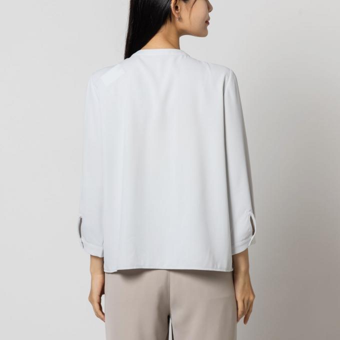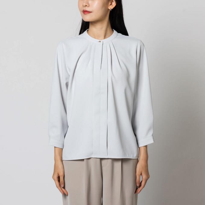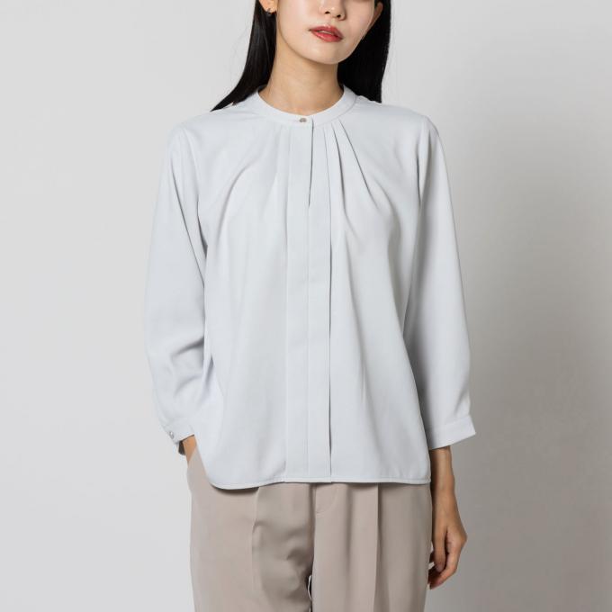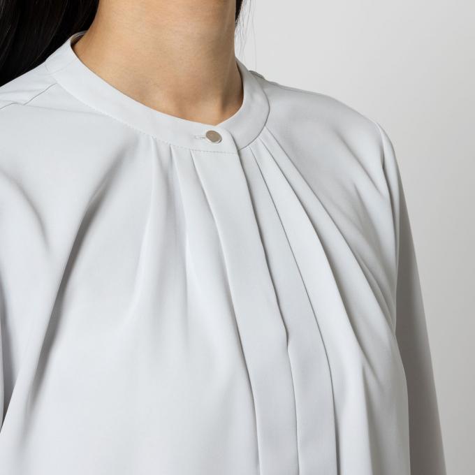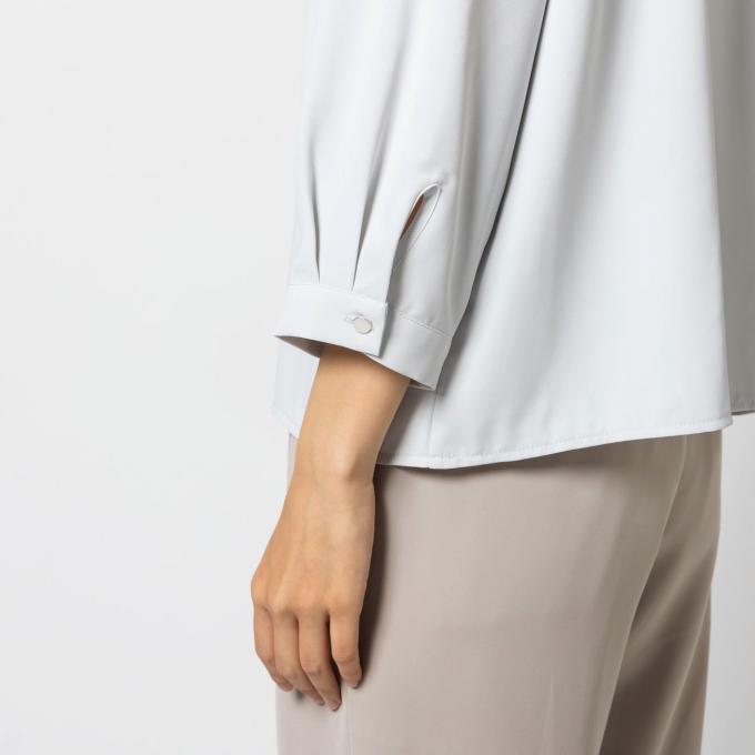 やわらかな印象を与える、淡いライトグレーのブラウス。