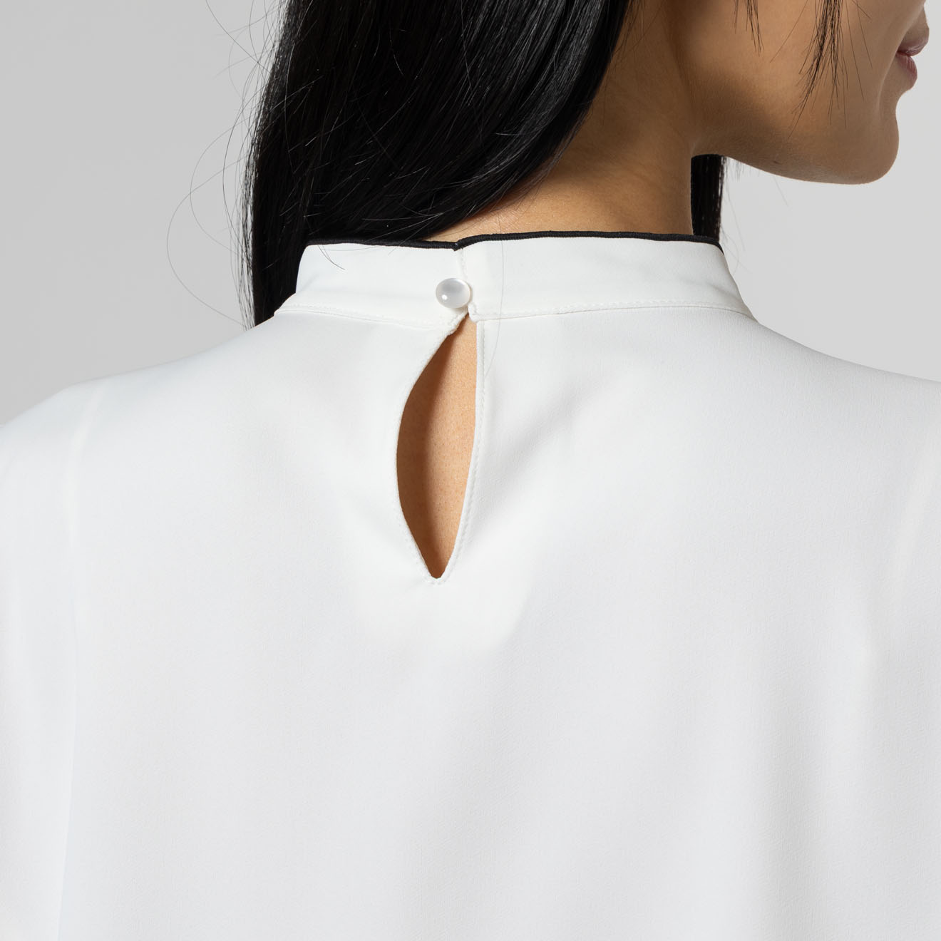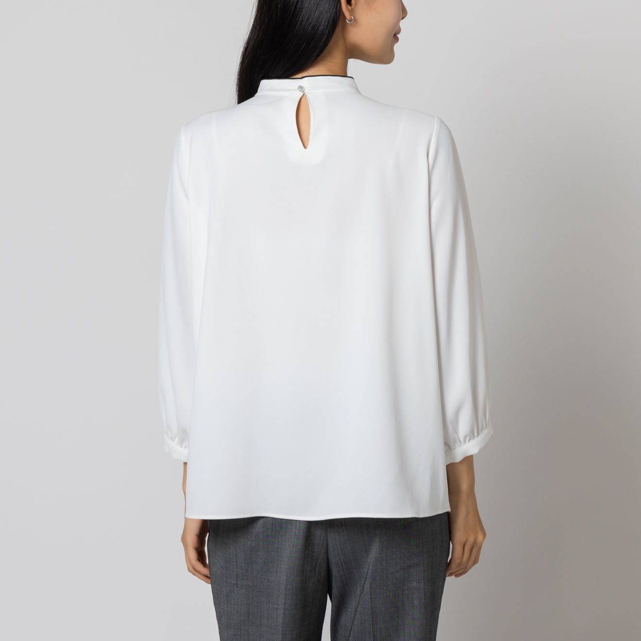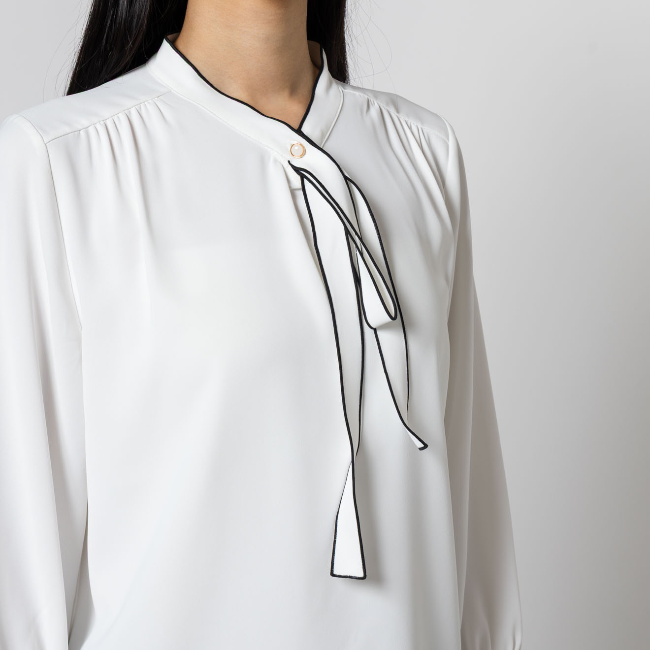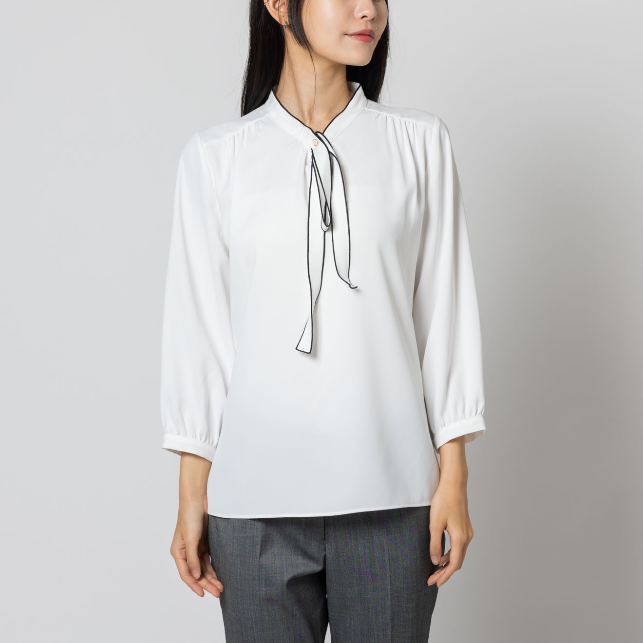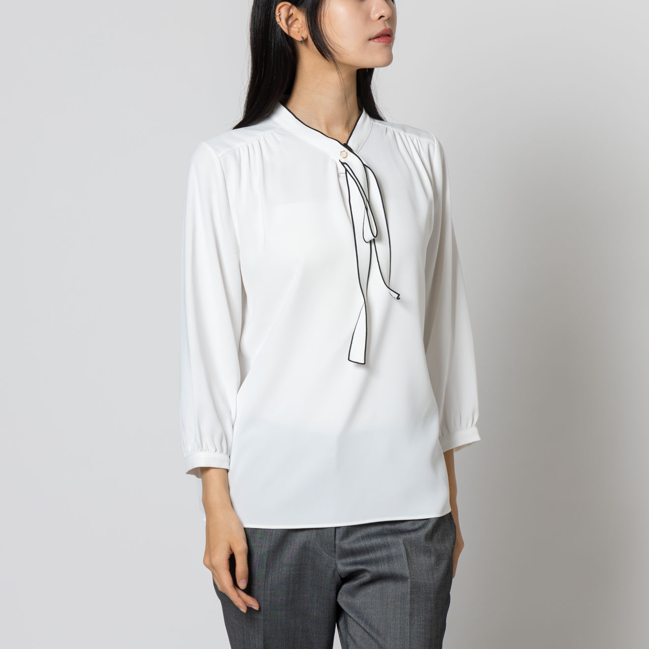 首元にあしらった細めのリボンディテールが、上品で柔らかな印象を与えるブラウス。