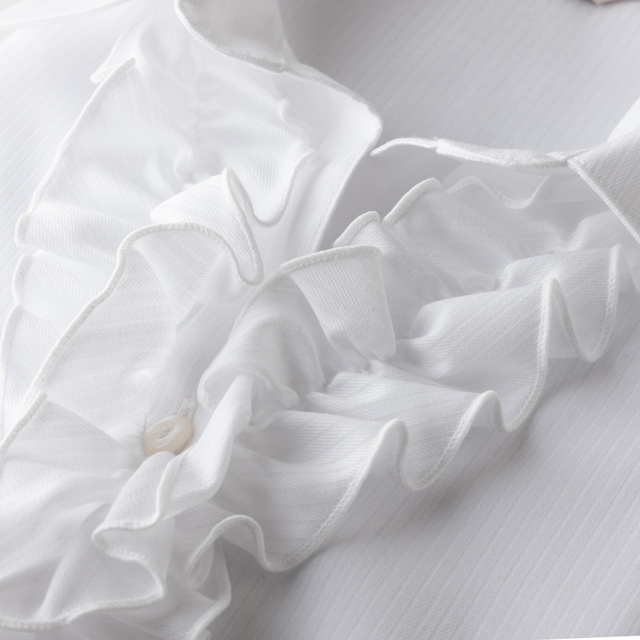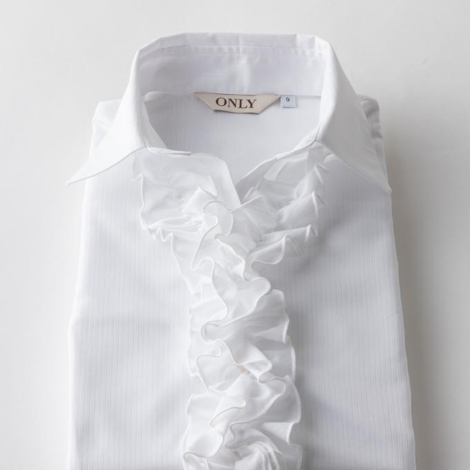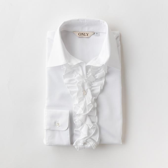 立体的なフロントフリルが目を引く、華やかなホワイトシャツ。