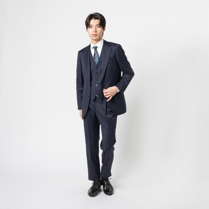 通年使える汎用性: 250g/mの軽量設計。季節を問わず、スリーピースとしての重厚感と軽やかな着心地を両立しました。
