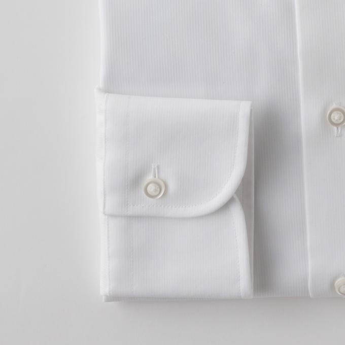 衿・カフスの芯地も通常の形態安定のものよりハリコシがありながら柔らかい1枚芯を使用。