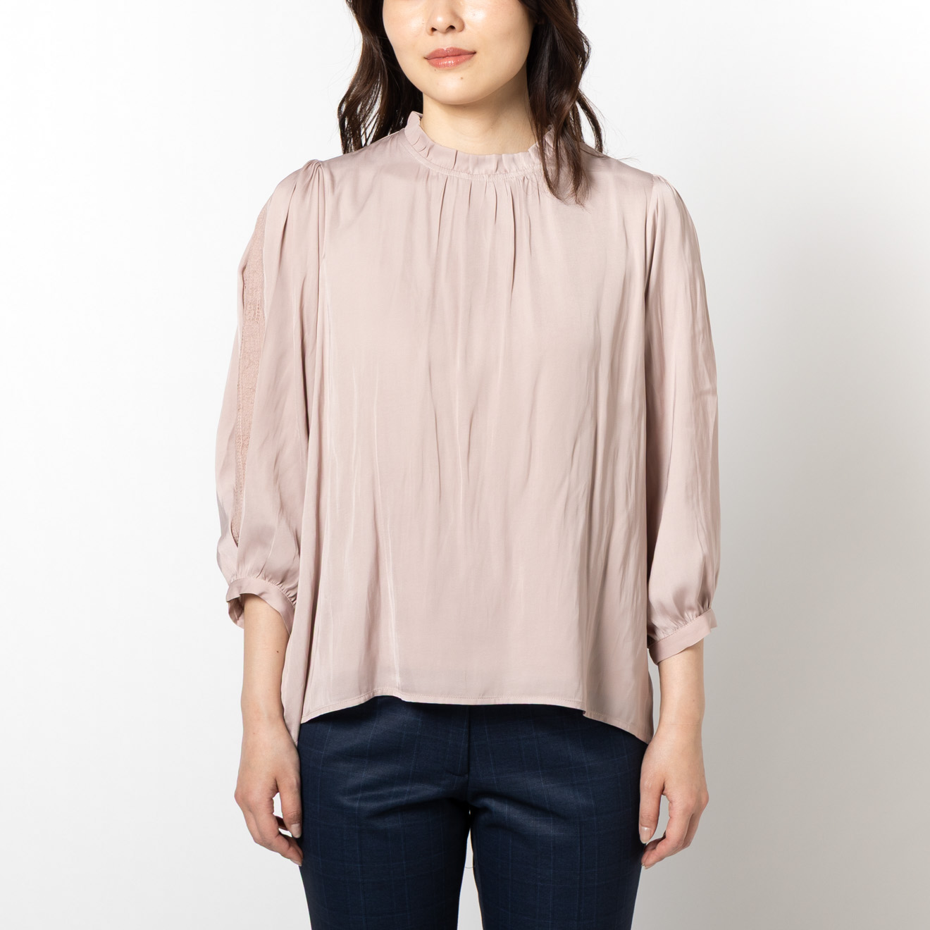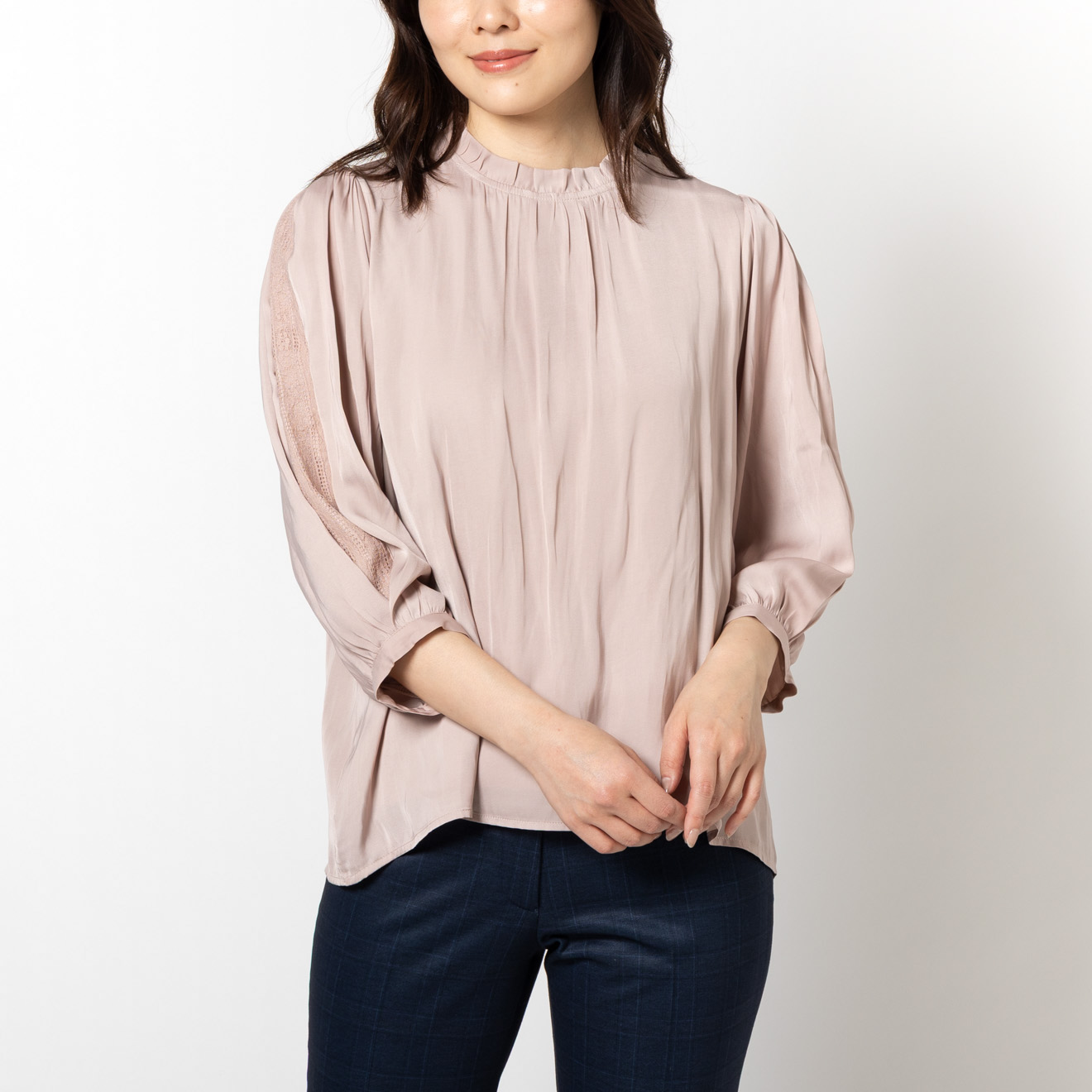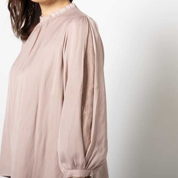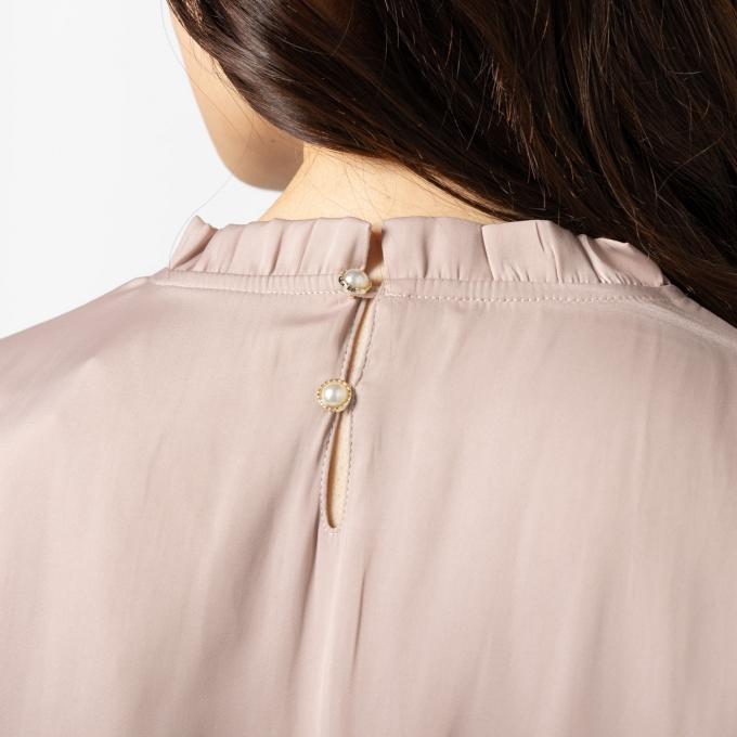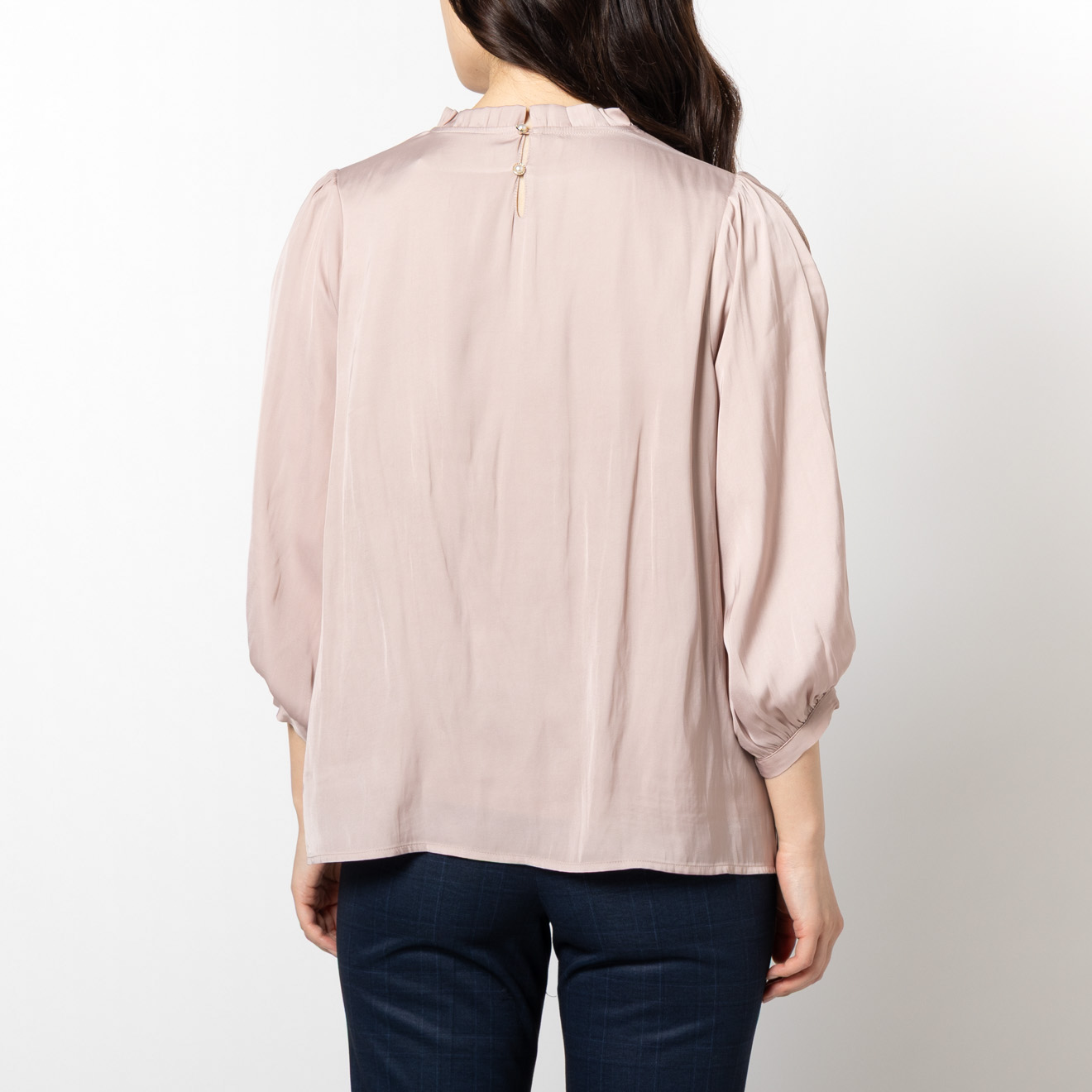 艶やかなベージュカラーが上品な印象を与えるブラウス。