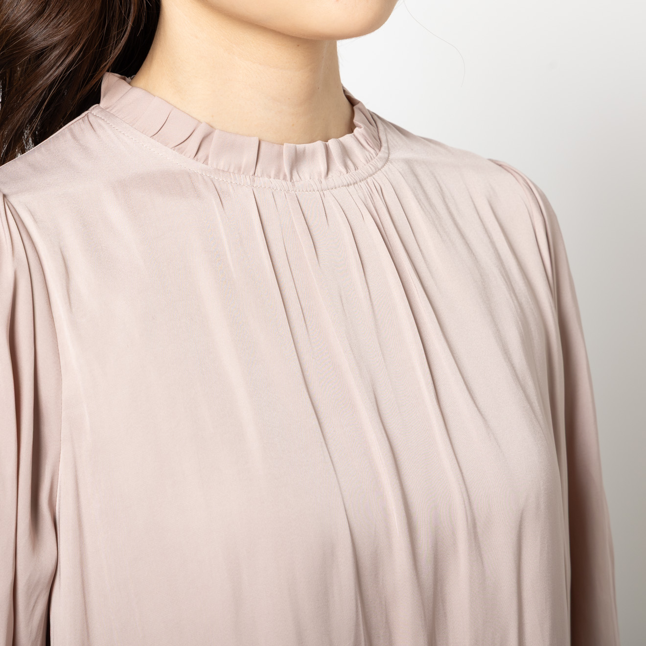 首元に施した繊細なギャザーが、顔まわりを華やかに演出します。